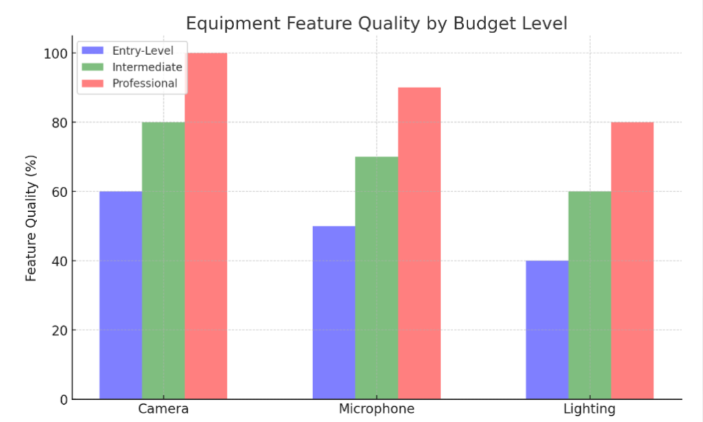 If you’re on a tight budget, an entry-level setup with basic equipment like a webcam and simple microphone can get you started. For those with a bit more to spend, an intermediate setup with higher quality camera, microphone and lighting may be the way to go.