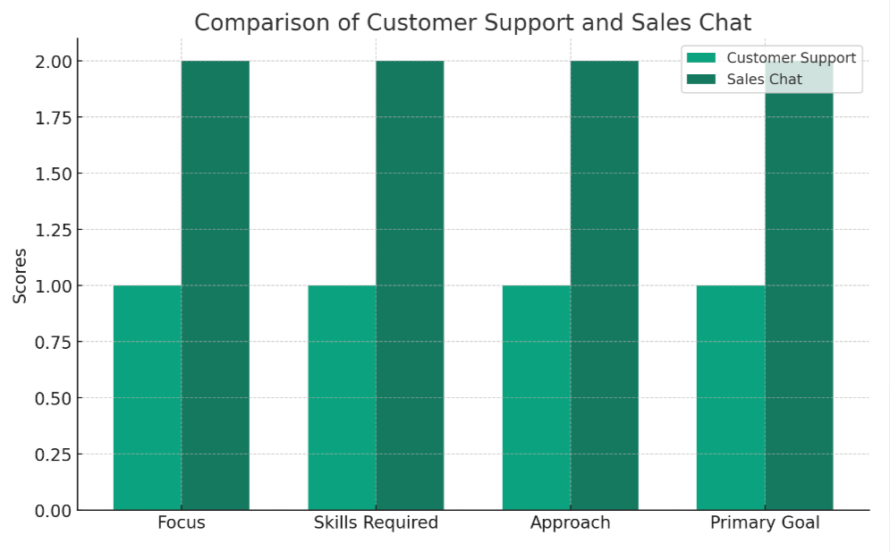 Customer Support focuses on addressing current customers’ product questions and concerns, while Sales Chat is geared towards driving sales and influencing potential customers’ decisions.