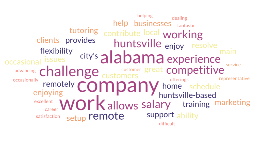 “Working remotely as a customer service representative for a Huntsville-based company has been a fantastic experience. The flexibility to work from home allows me to enjoy the city’s offerings while still advancing my career. The salary is competitive, and the company provides excellent training and support. The only challenge is occasionally dealing with difficult customers, but the satisfaction of helping resolve their issues makes it all worthwhile.”