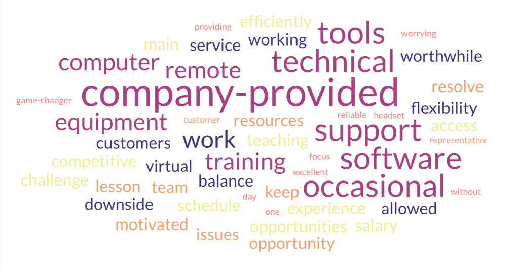 “Being a remote technical support specialist with company-provided equipment has allowed me to thrive in my role. The computer, software, and technical tools are top-notch, enabling me to troubleshoot and resolve issues efficiently. The continuous training and opportunities for growth keep me engaged and motivated. The only downside is the occasional pressure to meet metrics, but the supportive team environment and the satisfaction of helping customers make it all worthwhile.”