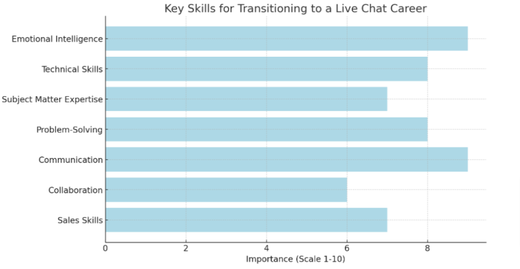 Emotional intelligence, technical skills, subject matter expertise, problem-solving, effective communication, collaboration, and sales are all transferable customer service skills that can be valuable in a live chat career.