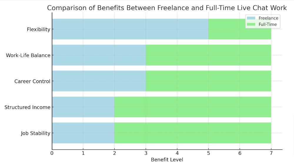 Full-time live chat work provides job stability and a structured income, allowing for better career control and work-life balance. However, it may lack flexibility and job security, potentially leading to a lack of job satisfaction.